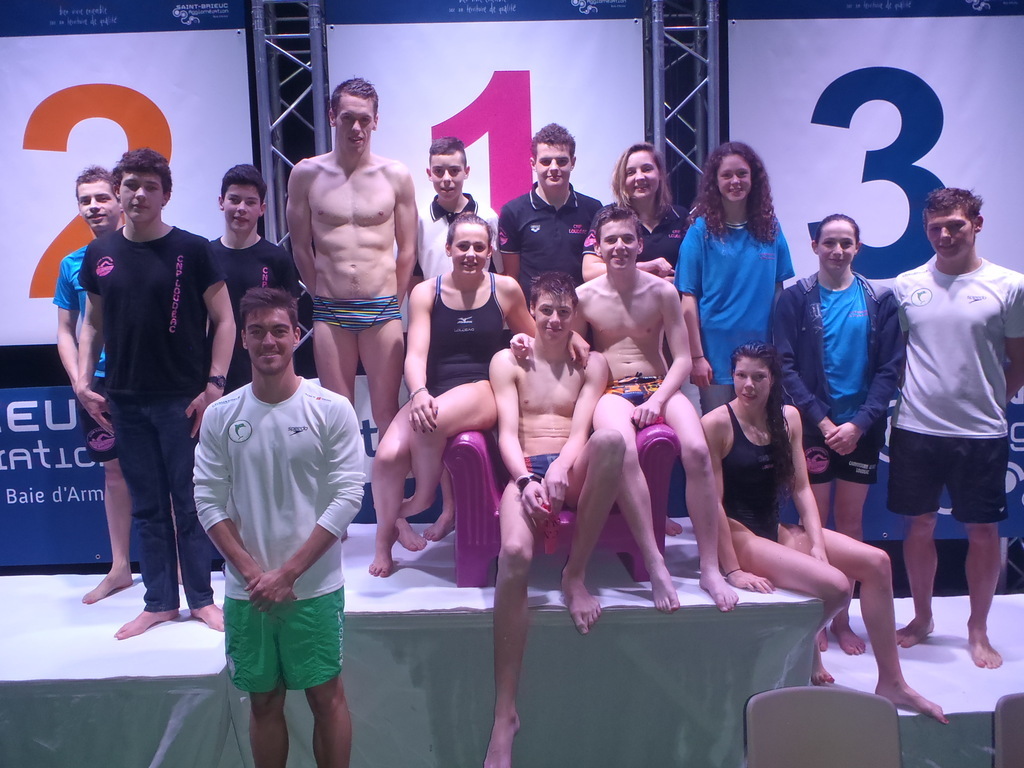 12 nageurs Loudéaciens ont participé à la 6ème édition du Meeting National Aquabaie d’Armor à Saint-Brieuc. Au total, 350 nageurs venus de tout le grand ouest ont participé à cette grande fête de la natation Costarmoricaine dans une ambiance très festive. En tête d’affiche de ce meeting, il y avait Paul Lemaire, des Dauphins de Toulouse, spécialiste de papillon et membre de l’équipe de France lors des derniers championnats d’Europe à Berlin (présent, ici, sur la photo avec les nageurs Loudéaciens ainsi qu’avec Benoit Jan, ex-Loudéacien et néo-Toulousain).